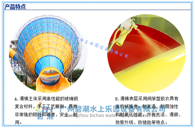B. 滑梯表層采用間苯型膠衣具有高機械強度,耐高溫、耐腐蝕性和耐氧化性能,并有光潔、滑順、防紫外線、防褪色等特點。