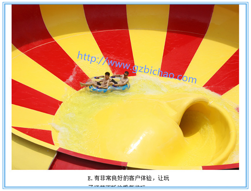 水上樂園設(shè)備、水上游樂設(shè)備超級巨獸碗滑梯又稱旋渦滑梯,占地2000多平方米,游客乘坐皮筏從13.5米高的平臺口滑下,通過一段長達幾十米的全封閉的管狀滑道之后,會高速沖入一個直徑 15米的巨碗,在離心力的帶動下,游客好像在太空中旋轉(zhuǎn)一樣,讓人目眩神迷,最后被吸入碗中間的洞口,游客會享受到難忘的滑行體驗,尖叫聲將伴隨滑梯的始終。該水滑梯深受青年人的喜愛,既刺激又好玩。